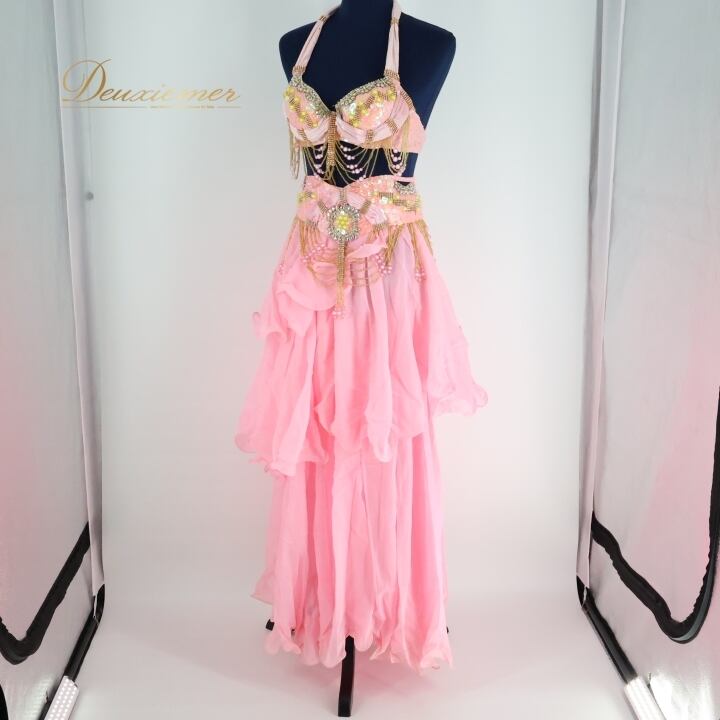 ベリーダンス オリエンタル 衣装 上下セット レディース ピンク系 薄ピンク ラメ ビーズ 装飾 レース 練習 舞台 発表会 イベント コスチューム かわいい フリル 豪華 トップス スカート ベルト アクセサリー ダンス 発表会用 舞台衣装 ダンス衣装