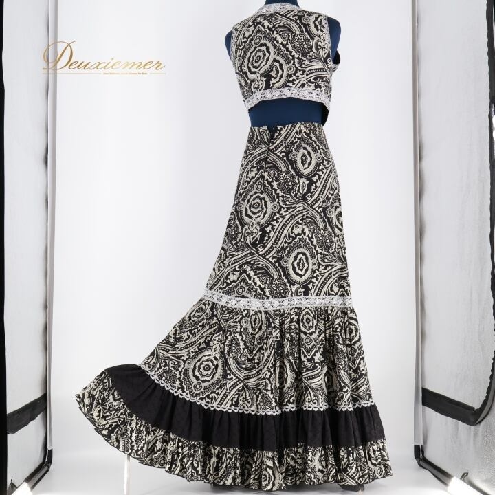 フラメンコ 衣装 ファルダ スカート チャレコ 黒 ボランテ フリル ペイズリー 柄 模様 ベスト ブラック系 レディース 衣装 おしゃれ 高級感 舞台衣装 イベント用 ダンスコスチューム フリルスカート 黒系 ペイズリー柄 セットアップ