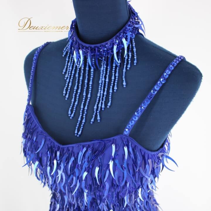 社交ダンス 衣装 ラテン ドレス ワンピース レッスンウェア レディース オールシーズン 青 チョーカー ブルー系 スパンコール ビース 派手 かわいい アシンメトリー 気品 ダンス用 ドレスアップ 衣装用 ステージウェア 輝く おしゃれ モダンスタイル