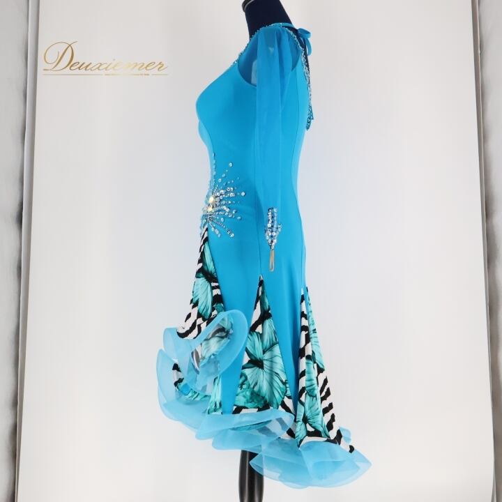 社交ダンス 衣装 ラテン ドレス ワンピース インザムード in the MOOD 青 水色 フリル デモ 競技 ダンス パーティ ブルー系 ゼブラ フリル付き スパンコール ストレッチ レディース おしゃれ ダンスウェア 競技用 ダンス衣装 ラテンダンス パフォーマンス ショー用 ドレスアップ パーティー 衣装