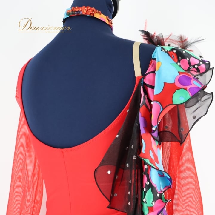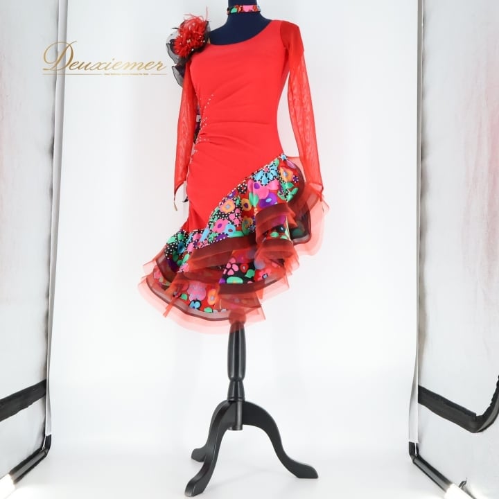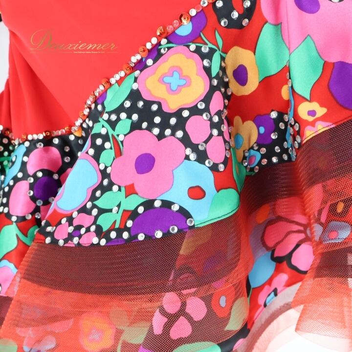 社交ダンス 衣装 ラテン ドレス ワンピース インザムード in the MOOD フリル 花柄 パーティ 発表会 レッド系 レトロ 花模様 ボリューム 衣装 女性用 発表会用 ドレッシー おしゃれ パーティ用 パフォーマンス用 フェスティバル用 ステージ衣装