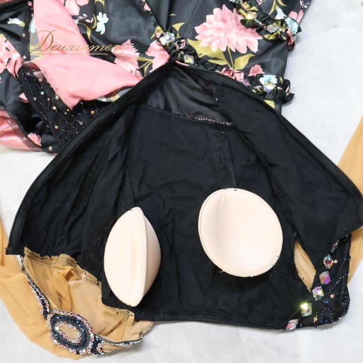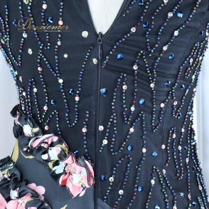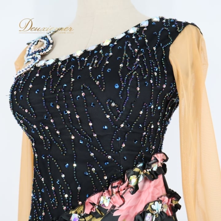 社交ダンス 衣装 スタンダード ドレス ワンピース スタンダードドレス フリル レース 花柄 ピンク デモ 競技 パーティ フロート 発表会 ブラック系 フラワー フリルドレス おしゃれ ダンスパフォーマンス 大人用 女性用