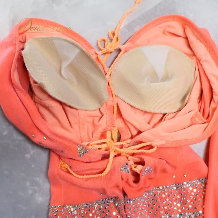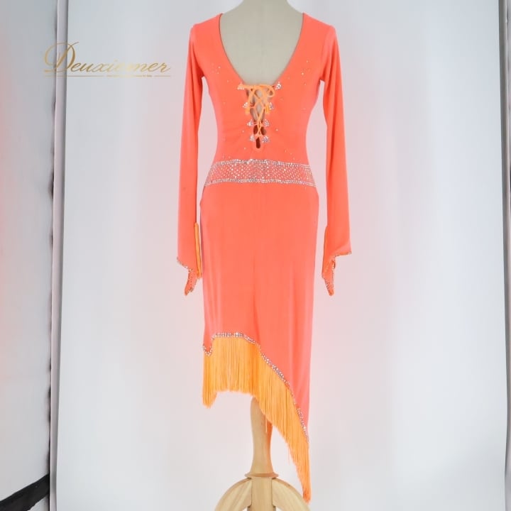 社交ダンス 衣装 ラテン ドレス ワンピース サーモンピンク デモ 競技 ダンス パーティ 舞台 フリンジ 柔らかい ピンク系 蛍光 色 可愛い 動きやすい 編み上げ 伸縮性