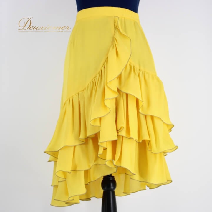 #社交ダンス #ダンス衣装 #スカート #イエロー #フリル #ポリエステル #日本製 #SEKINE #ダンスファッション #踊る #パフォーマンス #舞台衣装 #衣装 #ダンススタイル #華やか #女性用 #トルソー #フィット感 #イベント衣装 #ENUTSU