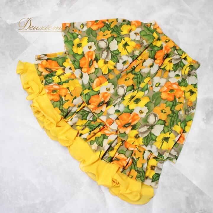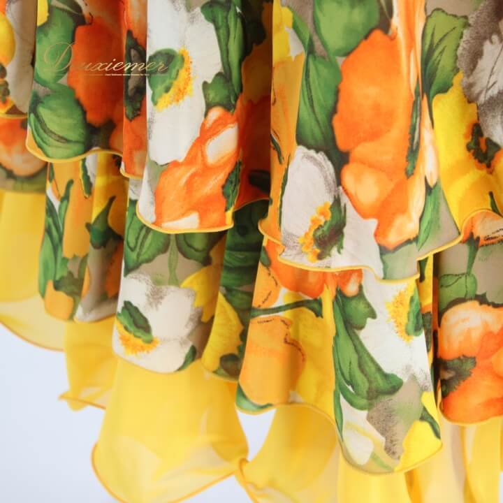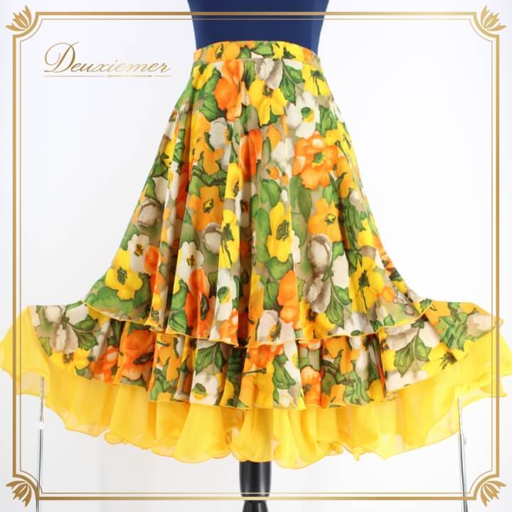 #社交ダンス #ダンス衣装 #スカート #ダンスファッション #日本製 #花柄 #イエロー #オレンジ #グリーン #二重スカート #伸縮性 #ファスナー #ダンススタイル #トルソー #女性用 #ダンスウェア #社交ダンス衣装 #パフォーマンス #フラワープリント #おしゃれ #ENUTSU