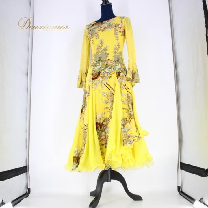 #社交ダンス #ダンス衣装 #ドレス #ダンスファッション #フォーマルドレス #パーティードレス #ダンススタイル #イエロードレス #華やかデザイン #花模様 #フレアスカート #プリマブティック #ファッションショー #ダンス衣装販売 #女性用トルソー #トルソー展示 #伸縮性 #ポリエステル #エレガント #ENUTSU