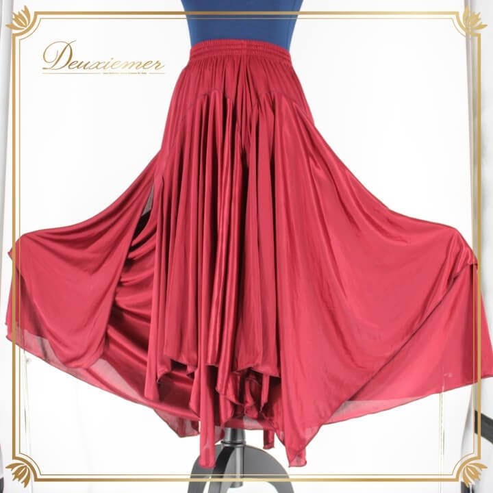 社交ダンス 衣装 スタンダード スカート レッスンウェア レディース オールシーズン レッド系 無地 赤 シンプル 派手 ボルドー ワインレッド 炎のような揺らめき 動きやすい フレア 膝下丈 ストレッチ レディース用 舞台衣装 ダンスウェア 夏用 秋用 冬用