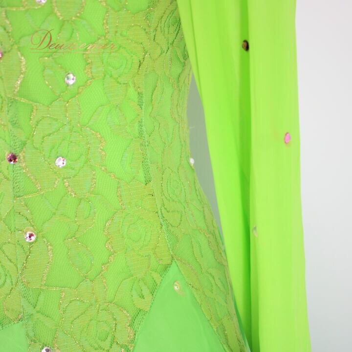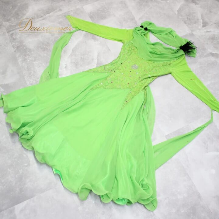 社交ダンス 衣装 スタンダード ドレス ワンピース レッスンウェア レディース オールシーズン prima boutique プリマブティック 黄緑 ライトグリーン系 フロート 花柄 レース ラインストーン フェミニン スポーツダンス おしゃれ