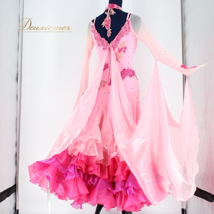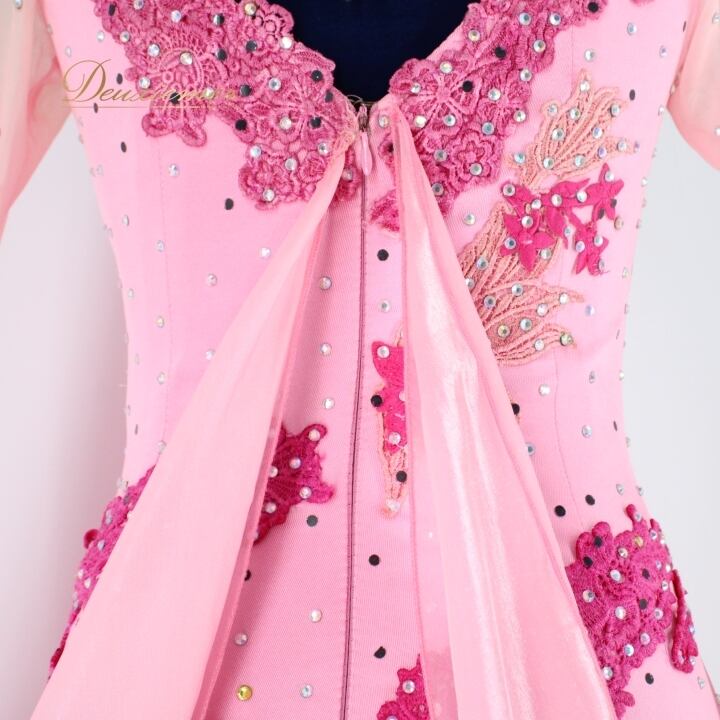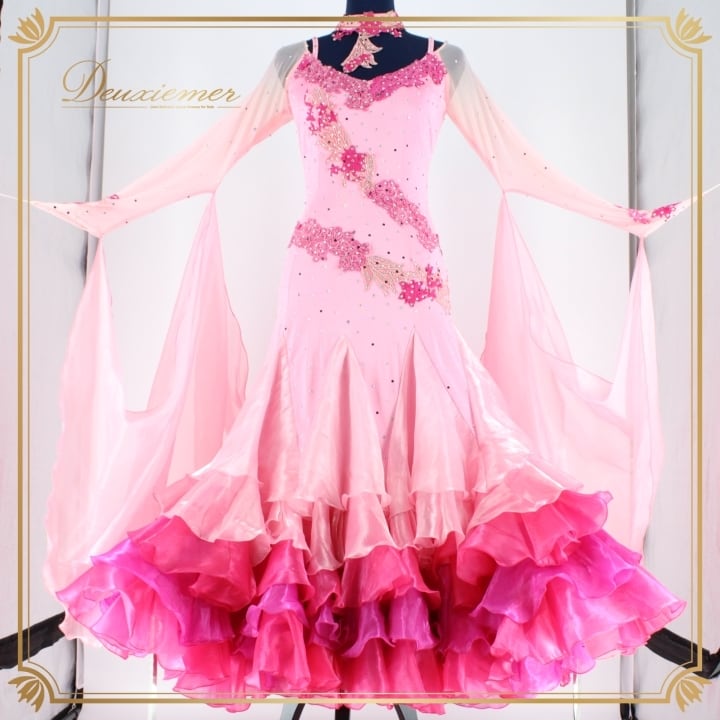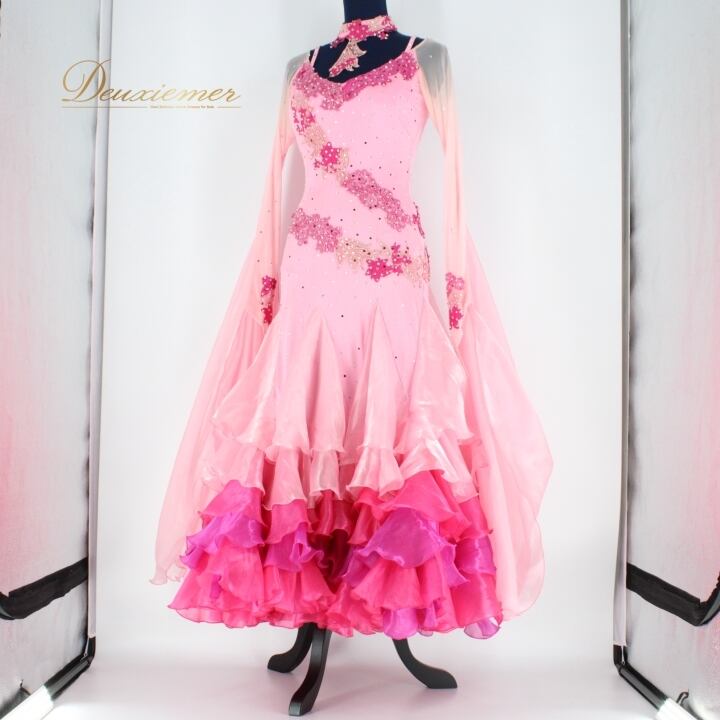 社交ダンス 衣装 スタンダード ドレス スタンダードドレス ワンピース フリル フロート レース デモ 競技 ダンス パーティ ピンク系 ピンク フリルスカート おしゃれ デザイン ふんわり 軽やか 練習用 発表会 大人用 女性用 競技用衣装 ドレスアップ