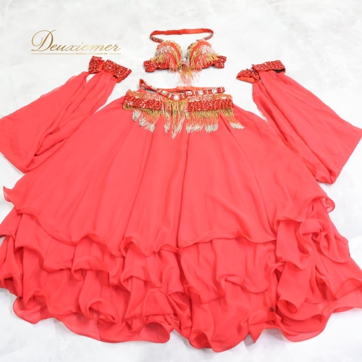 #ベリーダンス #オリエンタル #衣装 #ダンス #エキゾチック #フォークロア #コスチューム #パフォーマンス #イベント #衣装セット #トップス #スカート #装飾 #煌びやか #赤い衣装 #ダンススタイル #ベルト #ウエストゴム #パーティー #ENUTSU