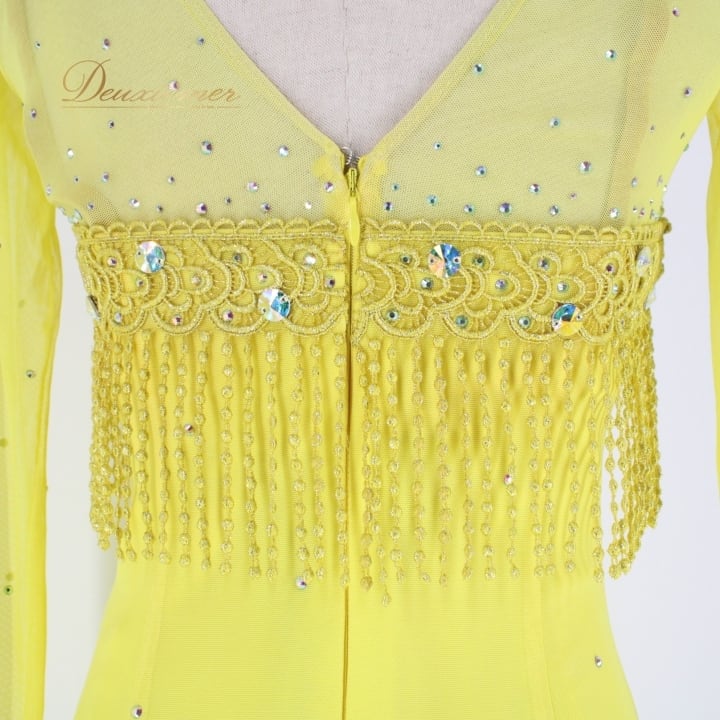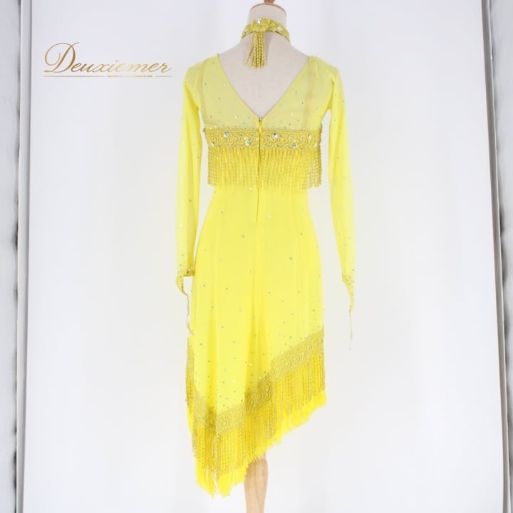社交ダンス 衣装 セキネ SEKINE ラテン ドレス ワンピース ラテンドレス 日本製 黄色 フリンジ ビーズ お洒落 デモ 競技 ダンス パーティ 発表会 イエロー系 おしゃれ 上品 カジュアル フォーマル ステージ パフォーマンス 透け感 エレガントデザイン
