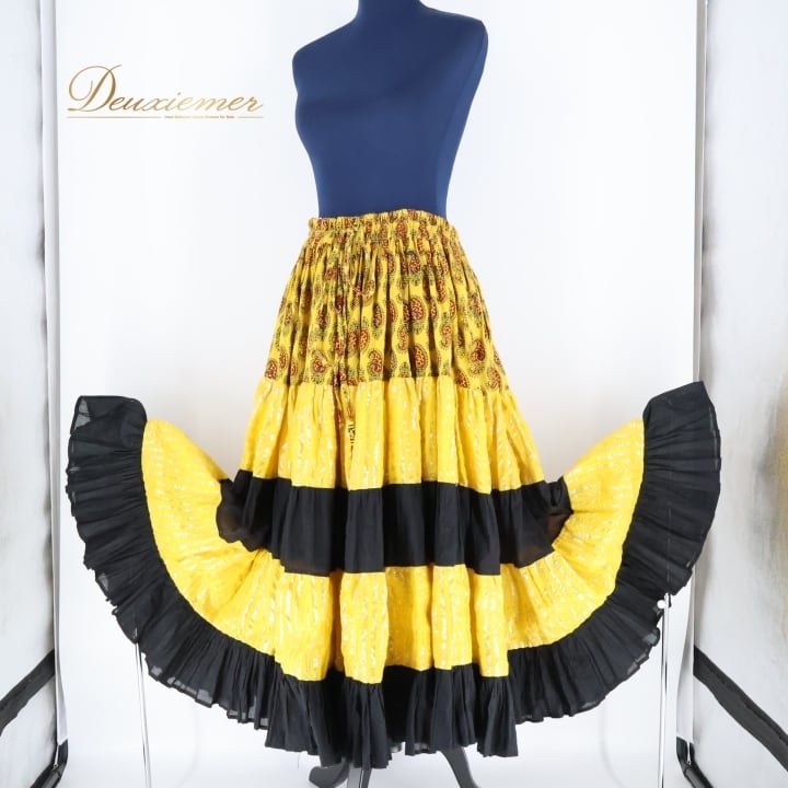 ベリーダンス 衣装 ジプシー スカート eden 25ヤード イエロー系 黄色 ブラック系 黒 ラメ 柄 模様 ロング フリル 練習 舞台 発表会 イベント おしゃれ フェス ファッション レディース ダンス衣装 フリルスカート かわいい カジュアル
