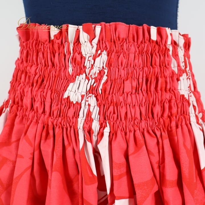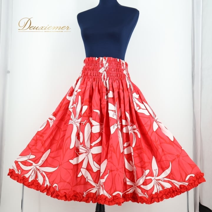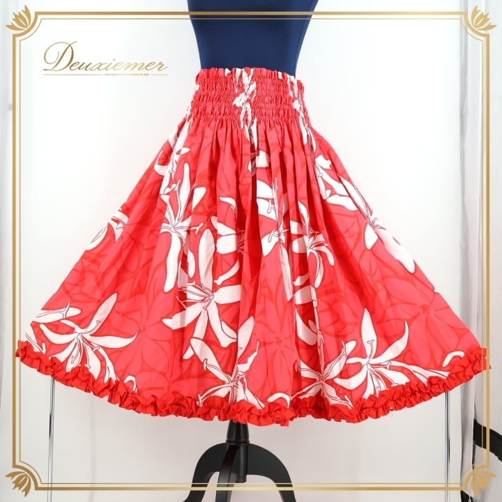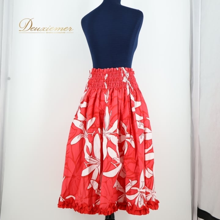#フラダンス #フラダンス衣装 #パウスカート #日本製 #ハワイアンファッション #レッド #ホワイト #花柄 #フリル #ダンス衣装 #ウエストゴム #ポリエステル #綿混合 #ダンス #衣装 #女性用トルソー #ファッション #おしゃれ #フラスタイル #ENUTSU