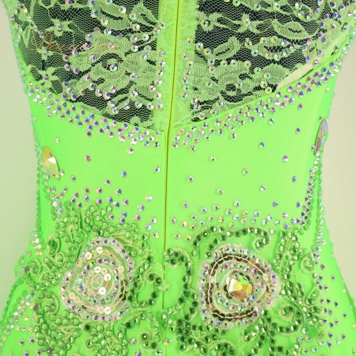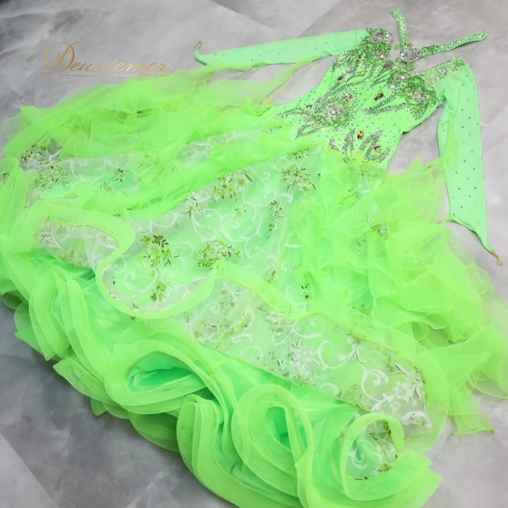 社交ダンス 衣装 スタンダード ドレス スタンダードドレス ワンピース デモ GRANT 競技 ダンス パーティ 発表会 フロート 黄緑 グリーン系 フリル レース スパンコール トラインストーン 豪華 蛍光 ストレッチ 衣装 Mサイズ おしゃれ 競技用 フォーマル 発表会用 綺麗 フェスティバル