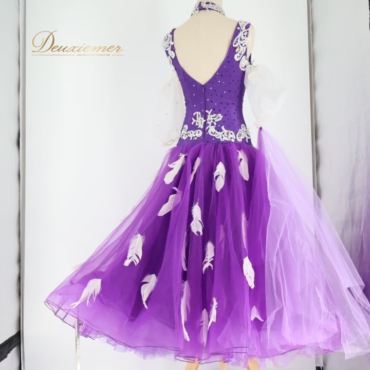 社交ダンス 衣装 スタンダード ドレス スタンダードドレス ワンピース 紫 羽 チュール デモ 競技会 発表会 パーティ パープル系 豪華デザイン フェステージ衣装 ダンス衣装 フォーマルドレス 発表会衣装 女性用ドレス 演技用衣装 華やか コスチューム ショー衣装