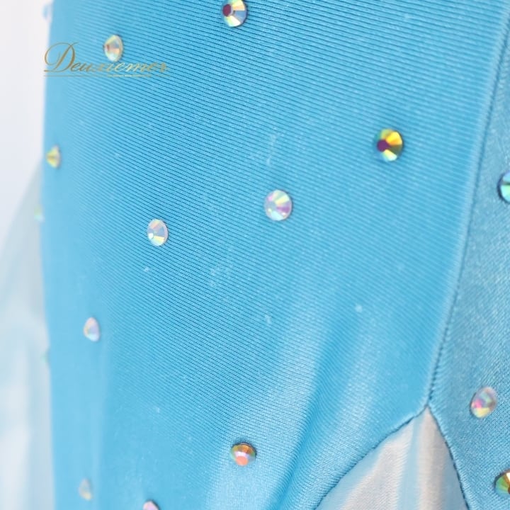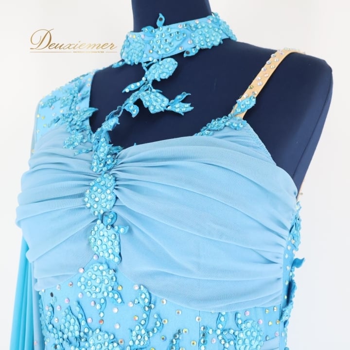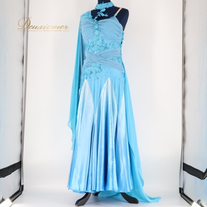 社交ダンス 衣装 スタンダード ドレス スタンダード ワンピース 水色 フロート レース 光沢 デモ 競技 ダンス パーティ 発表会 ブルー系 エレガント フェミニン スカート 発表会用 ダンス用服 上品 フォーマル 競技会用 大人 レディース 衣装 おしゃれ