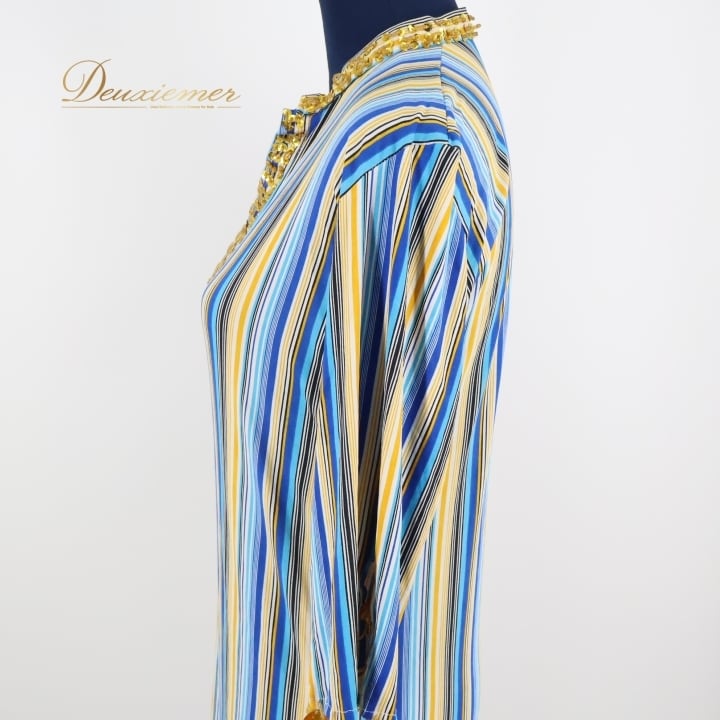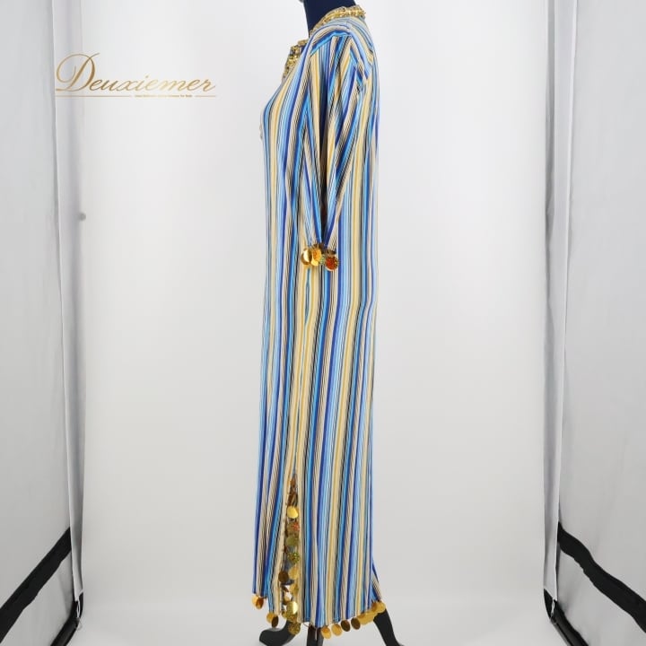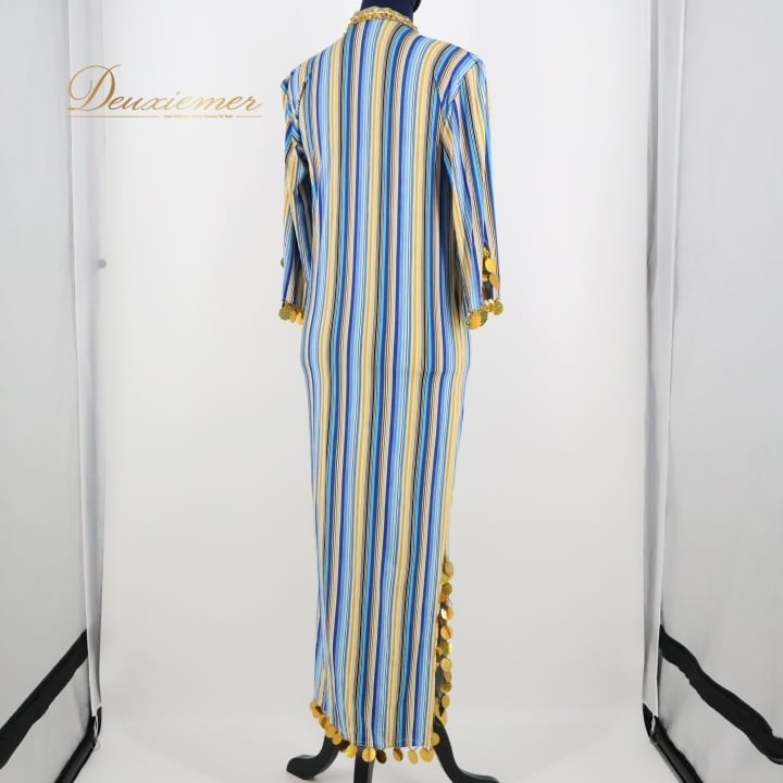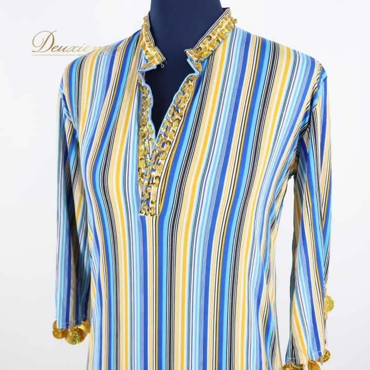 ベリーダンス 衣装 サイーディドレス ワンピース ドレス ガラベーヤ ブルー系 青 イエロー系 黄色 ゴールド ラメ ストライプ柄 舞台 発表会 パーティー コスチューム スパンコール 目を引く おしゃれ デザイン