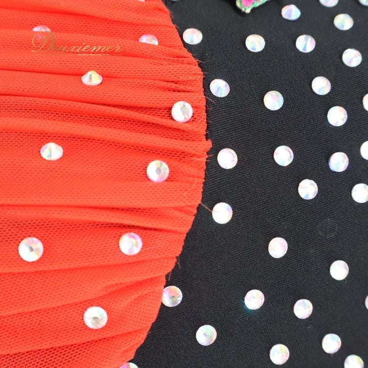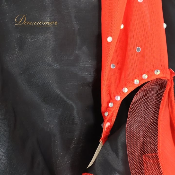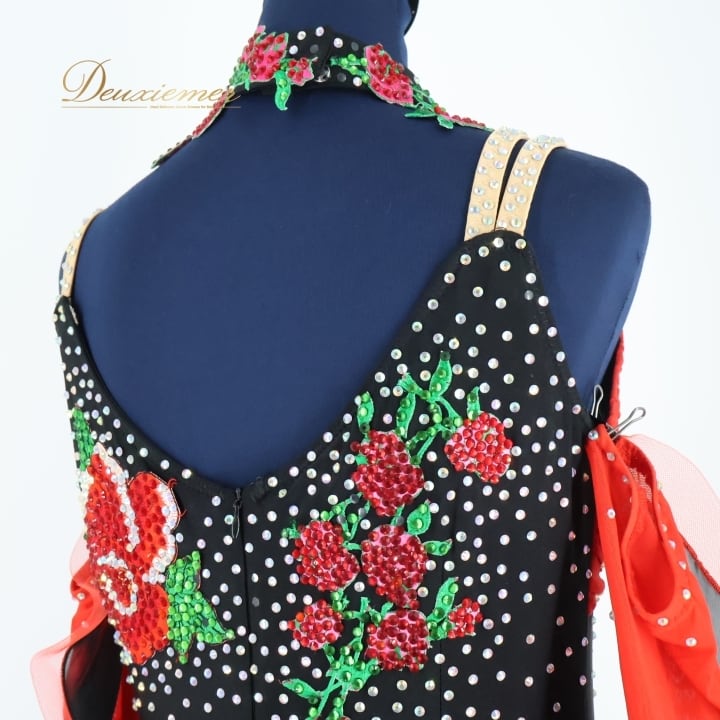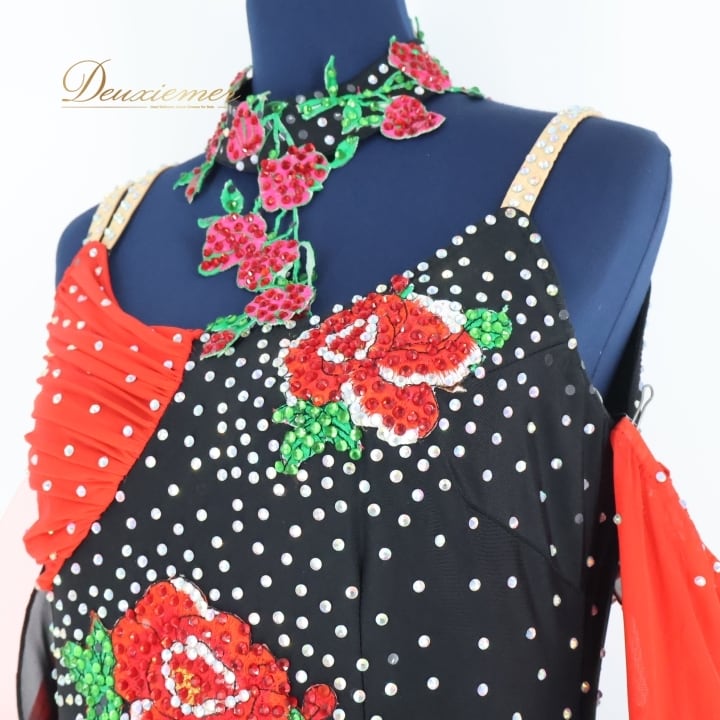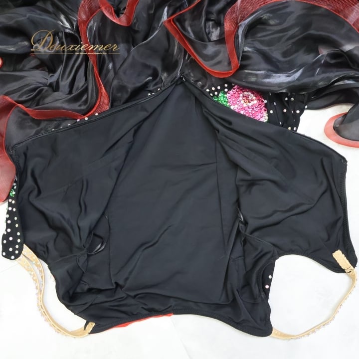 #社交ダンス #ダンス衣装 #ワンピース #ダンスドレス #フリル #エレガント #赤黒 #パーティードレス #トルソー #ファッション #女性用衣装 #ダンスパフォーマンス #ダンススタイル #オシャレ #特別な日 #演出服 #リーダー #コスチューム #ダンスイベント #ENUTSU