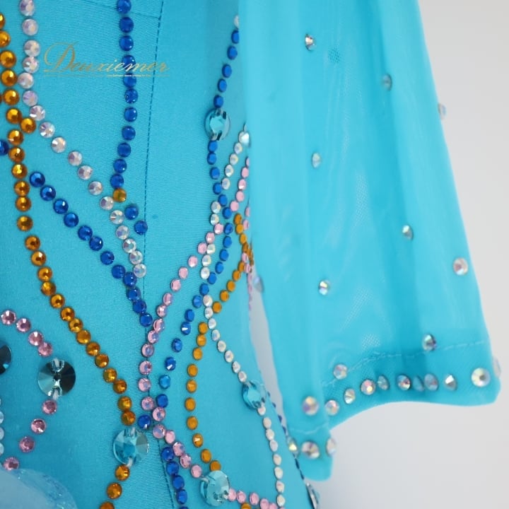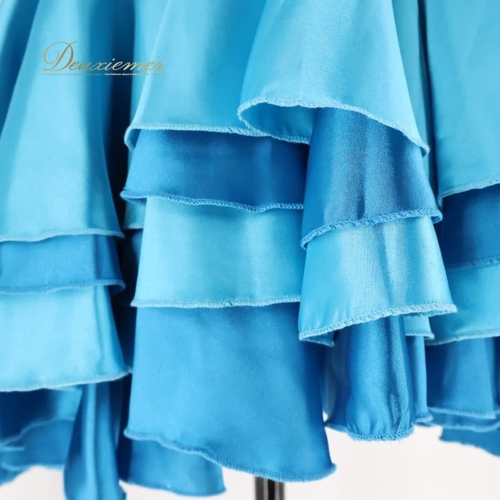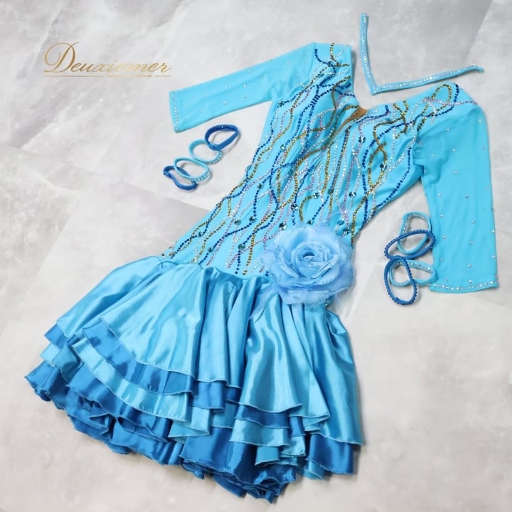 社交ダンス 衣装 ラテン ドレス ワンピース 水色 レース フリル 青 デモ 競技 ダンス パーティ 発表会 ブルー系 かわいい フリルスカート コサージュ 競技用 おしゃれ 大人用 女性用 Mサイズ