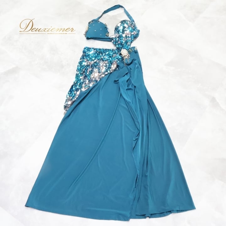 #ベリーダンス #オリエンタル衣装 #ダンス衣装 #ベリーダンスコスチューム #衣装セット #ダンサー #ラメ衣装 #青緑色 #スタイル #ファッション #ダンスパフォーマンス #ボディアクセサリー #トルソー #ウエストゴム #スリットスカート #カスタム衣装 #レッスン用 #イベント衣装 #女性ファッション #ENUTSU