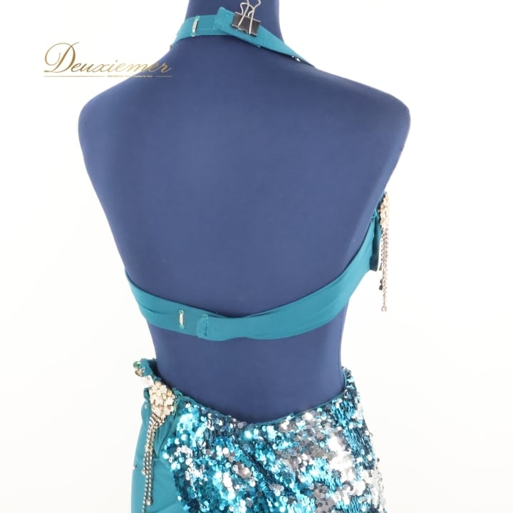 ベリーダンス オリエンタル 衣装 上下セット RAQIA HASSAN グリーン系 緑 ブルー系 青 青緑 ラインストーン スパンコールラメ ラメ 舞台 発表会 イベント ベリーダンス衣装 コスチューム 豪華 パフォーマンス ダンス衣装 おしゃれ 衣装セット