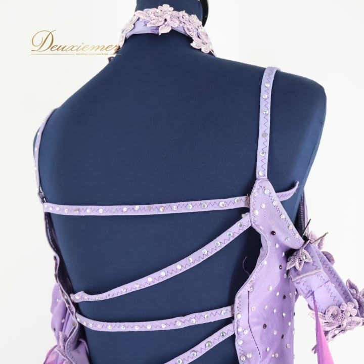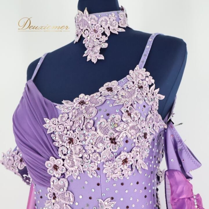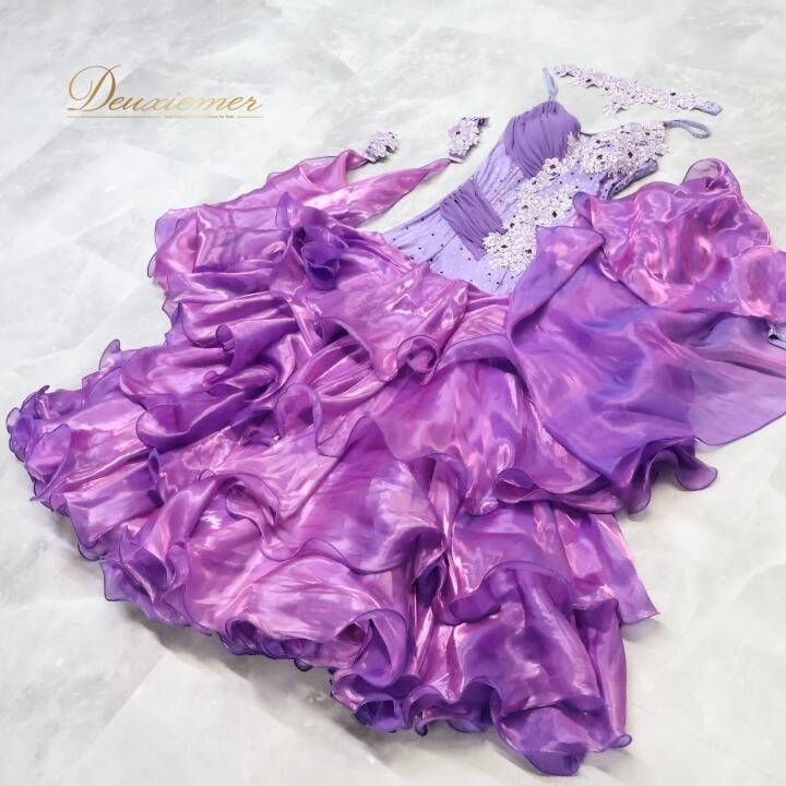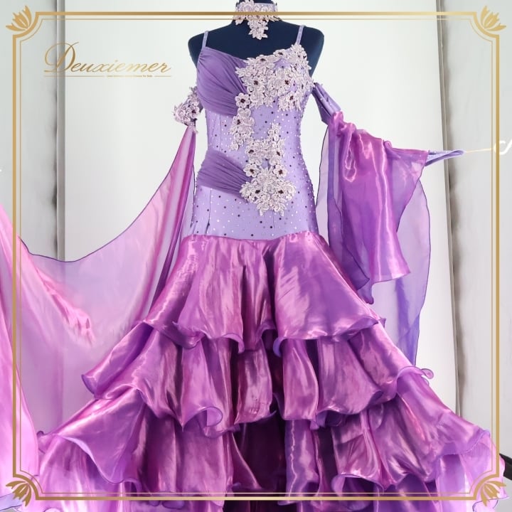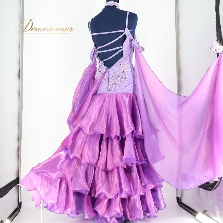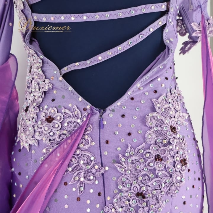 社交ダンス 衣装 スタンダードドレス スタンダード ドレス ワンピース フロート デモ 競技 ダンス パーティ フリル レース 紫 パープル系 豪華 スカート 光沢 女性用 Lサイズ パーティードレス 競技用ダンス 上品
