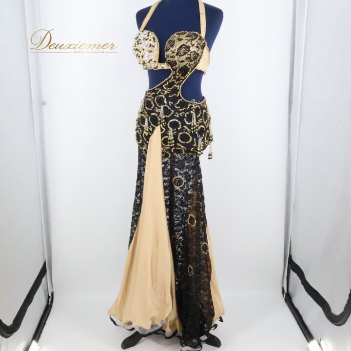 ベリーダンス オリエンタル 衣装 上下セット ゴールド系 ブラック系 黒 花柄 一体型 ラインストーン ビーズ 装飾 レース 舞台 発表会 イベント ゴージャス 装飾品 発表会用 おしゃれ ダンス衣装 イベント衣装 コスチューム 豪華 デザイン