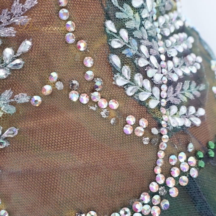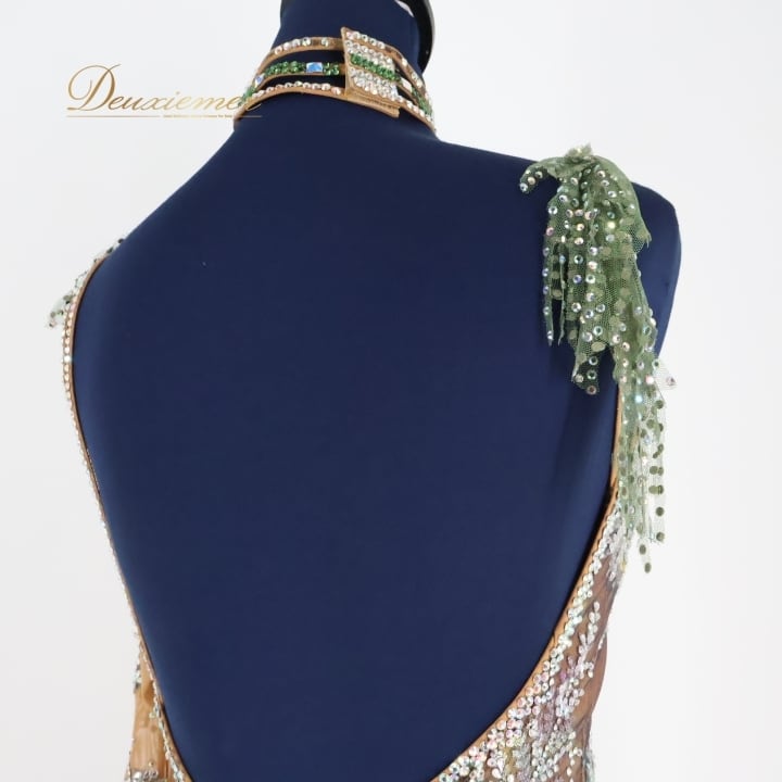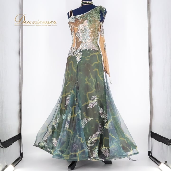 社交ダンス 衣装 スタンダード ドレス スタンダードドレス ワンピース 緑 フロート レース 柄 模様 デモ 競技 珍しい パーティ 発表会 グリーン系 ベージュ系 カーキ系 エレガント 華やか 発表会用 演出用 高級感 女性用 ダンス衣装 競技会用