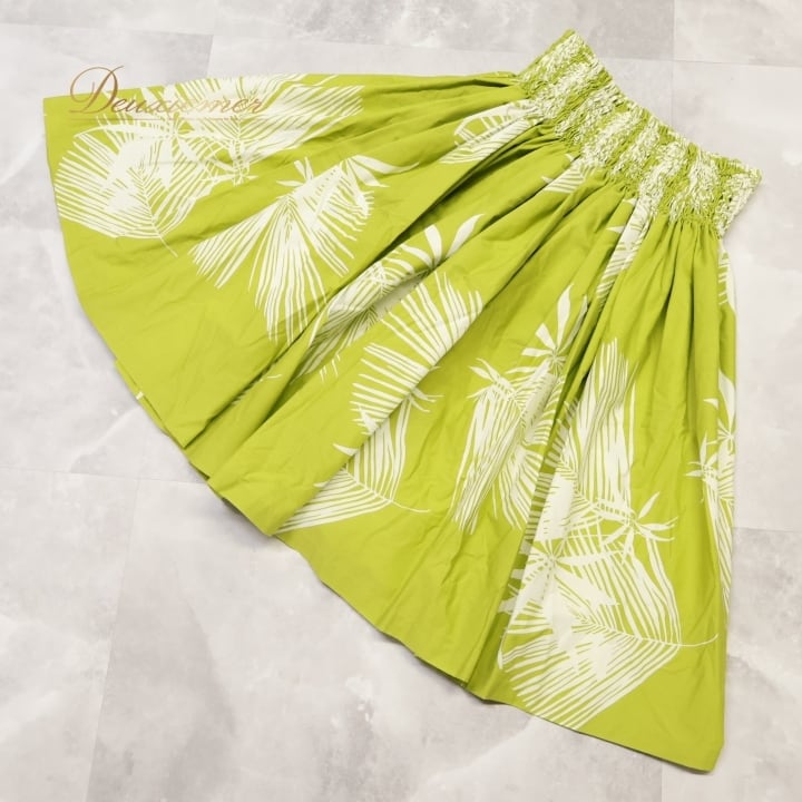 フラダンス 衣装 パウスカート グリーン系 シングル フラ ダンス 黄緑 爽やか ハワイアン レッスン 練習 かわいい 明るい アロハ 葉っぱ柄 ハワイアンプリント スカート ふんわり ホワイト系