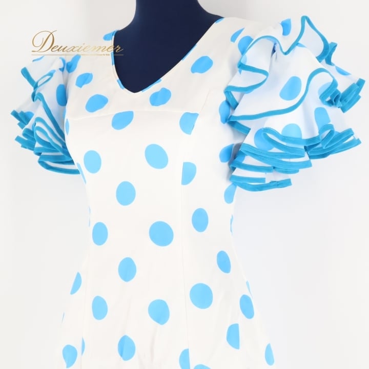 フラメンコ 衣装 ワンピース ドレス 白 水色 ドット 水玉 ボランテ フリル ダンス パーティ 発表会 舞台 ホワイト系 ブルー系 レディース おしゃれ かわいい フェミニン