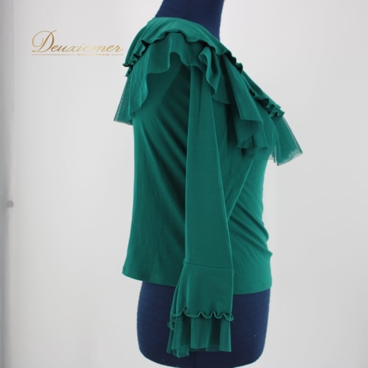 #社交ダンス #ダンス衣装 #ダンスウェア #トップス #女性用衣装 #グリーンカラー #フリルトップス #ダンスファッション #パフォーマンス衣装 #ダンススタイル #カジュアルダンス #伸縮性 #おしゃれ #コーディネート #華やか #品質表示 #フィット感 #トルソー #Mサイズ #ENUTSU