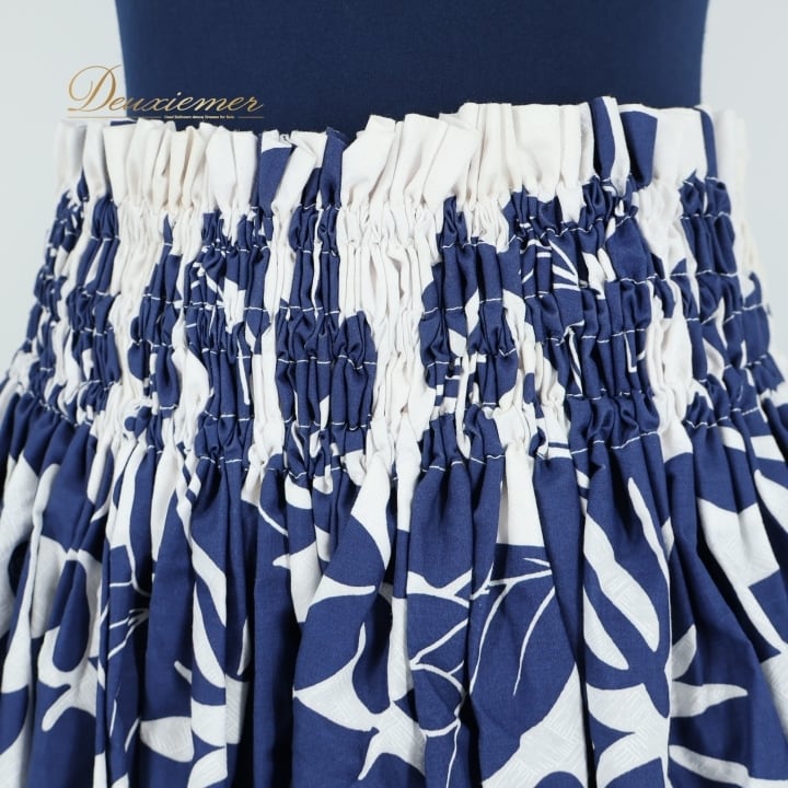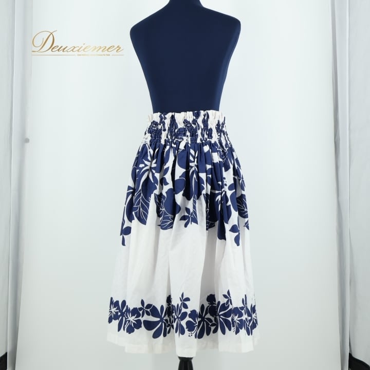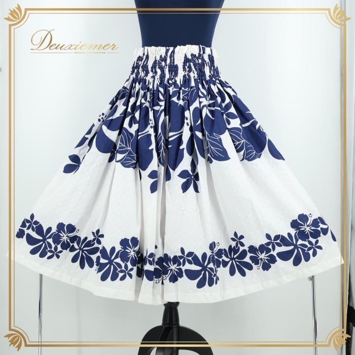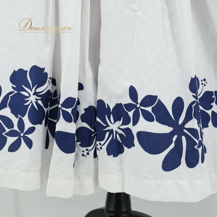 フラダンス 衣装 パウスカート ホワイト系 シングル フラ ダンス 白 紺 ハイビスカス柄 花柄 レッスン ハワイアン アロハ 爽やか 明るい スカート 練習 ハワイアンプリント 華やか ふんわり ネイビー系
