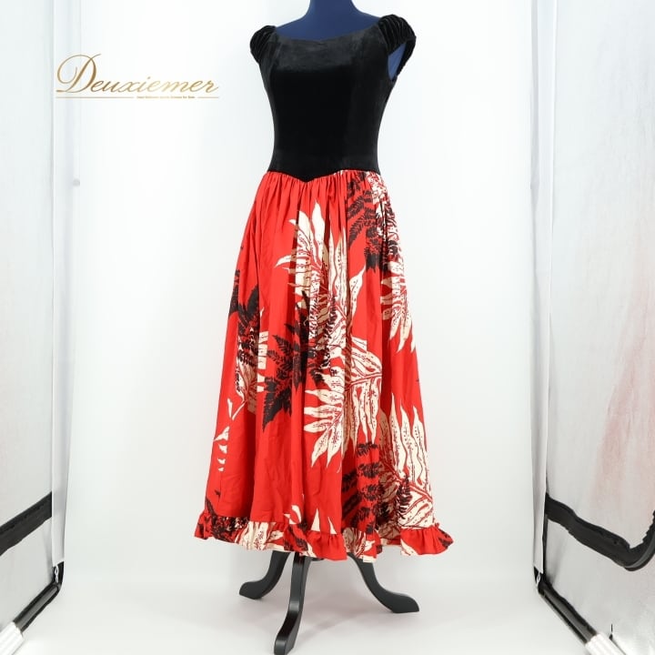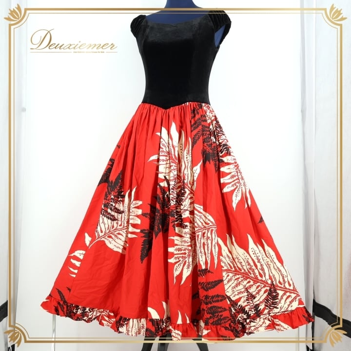 フラダンス 衣装 ワンピース ドレス レッド系 フラ ダンス 赤 黒 ベロア 光沢 高級感 パラパライ柄 フリル ハワイアン アロハ 鮮やか 華やか かわいい ハワイアンプリント ブラック系 ホワイト系