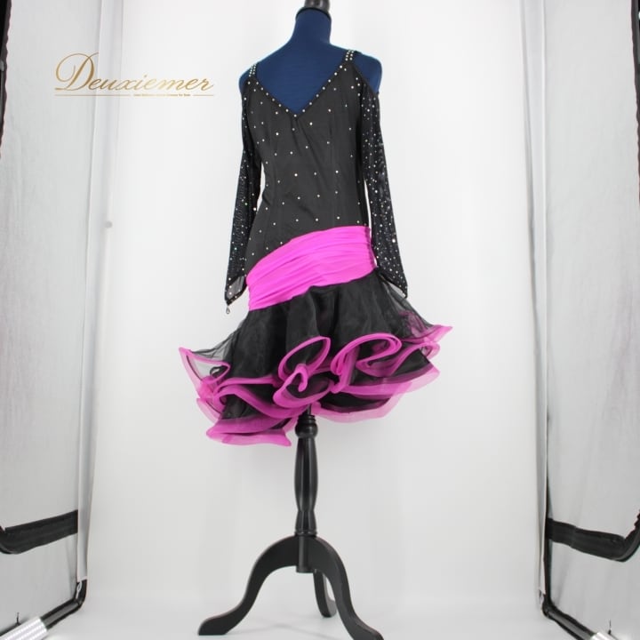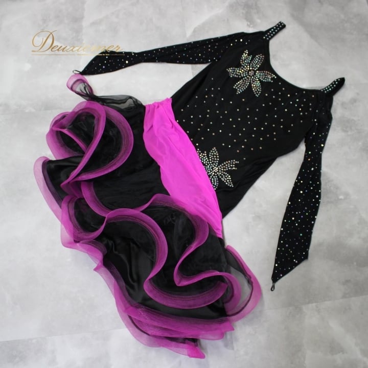 #社交ダンス #ダンスドレス #舞台衣装 #ブラックドレス #パープル #ラインストーン #ファスナー付き #伸縮性 #女性用衣装 #ダンス用衣装 #ダンスファッション #ドレスコーデ #衣装デザイン #トルソー #ダンスウェア #おしゃれ #パーティードレス #特別な日 #ダンススタイル #ENUTSU