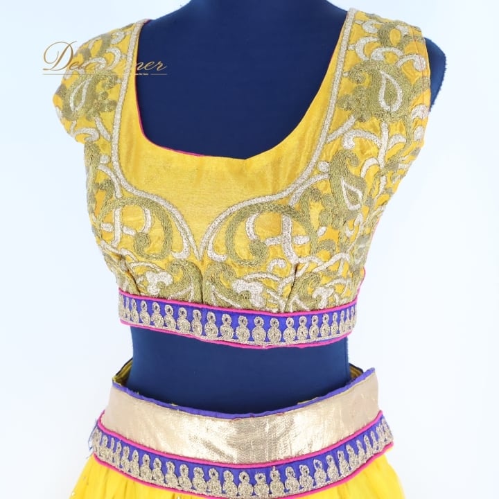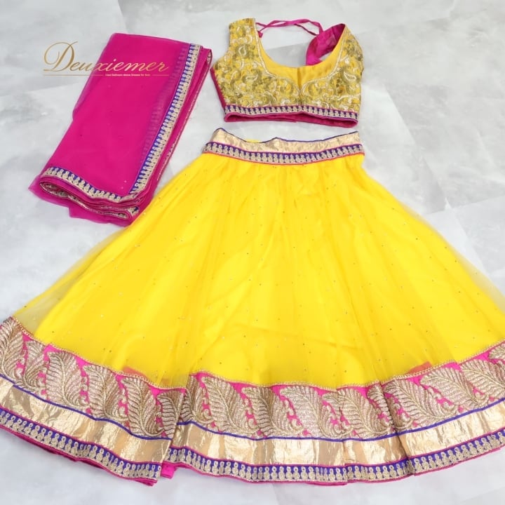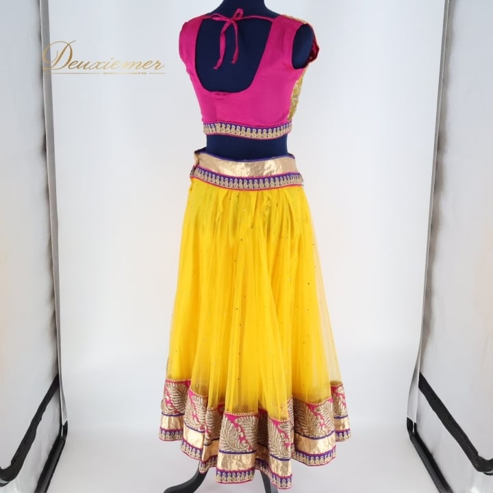 ベリーダンス ボリウッド 衣装 上下セット イエロー系 黄色 ゴールド ラメ 柄 模様 光沢 艶 レース 練習 舞台 発表会 イベント コスチューム 黄色ドレス セットアップ 煌びやか フェスティバル 民族衣装 エスニックスタイル
