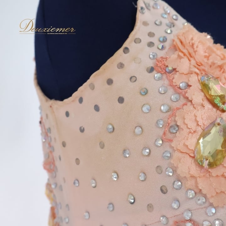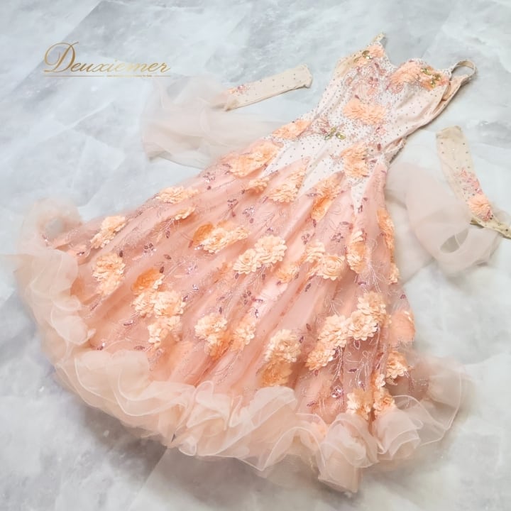 #社交ダンス #ダンス衣装 #ワンピース #ドレス #ダンスドレス #サーモンピンク #花モチーフ #スカート重ね #妊娠中の方も #ファッション #スタイル #レオタード #ダンスライフ #パーティーコーデ #女性用 #トルソー #おしゃれ #コスチューム #ダンスパフォーマンス #ENUTSU