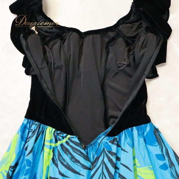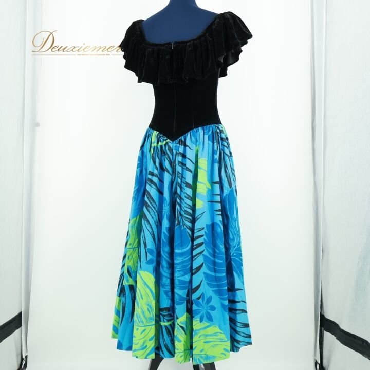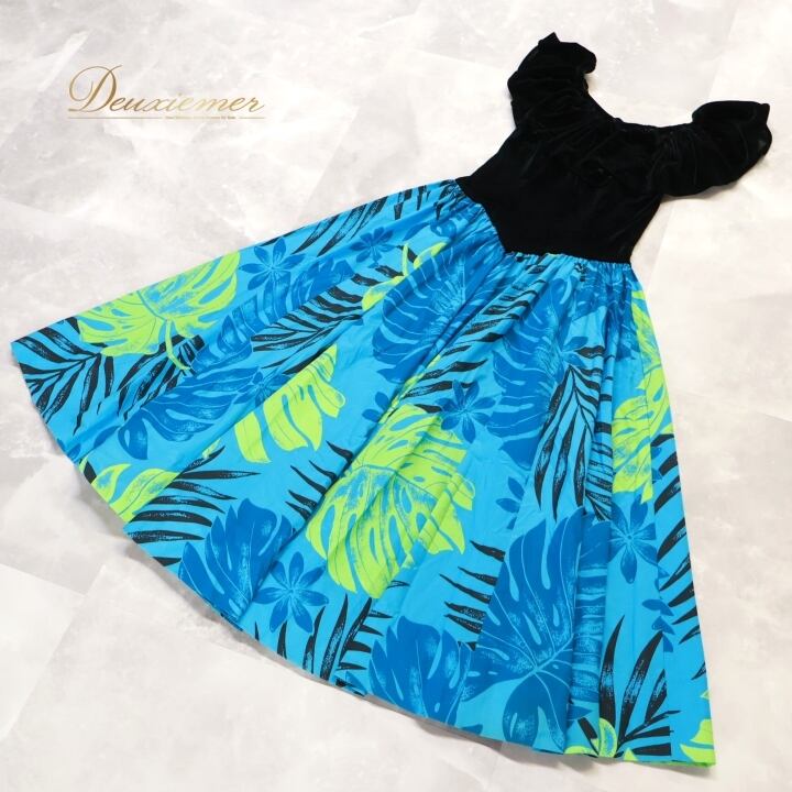 フラダンス 衣装 ワンピース ドレス ブルー系 フラ ダンス 水色 黒 緑 ベロア モンステラ柄 ヤシ柄 ティアレ柄 光沢 華やか 高級感 ハワイアン アロハ かわいい ハワイ製 フリル ハワイアンプリント ブラック系 グリーン系