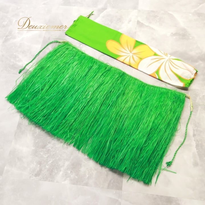フラダンス 衣装 モレ グリーン系 腰みの ショート丈 スカート タヒチアン ケース付き セット 緑 鮮やか ハワイアン アロハ タヒチアン 紐