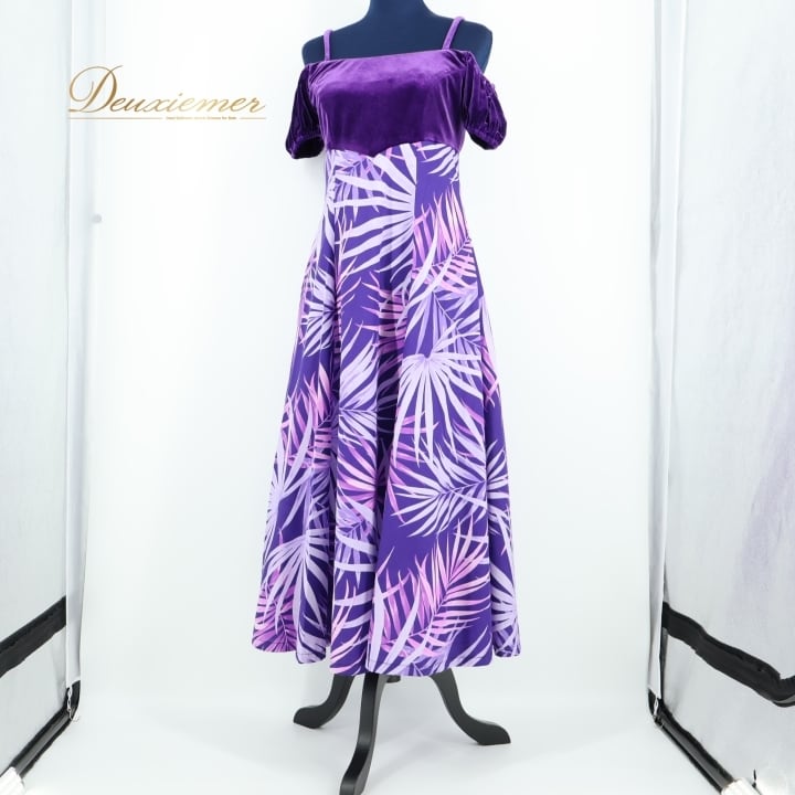 フラダンス 衣装 ワンピース ドレス パープル系 u'ino! フラ ダンス ヤシ柄 ベロア 鮮やか 華やか 光沢 高級感 オフショルダー ハワイ製 ハワイアン アロハ ハワイアンプリント uino