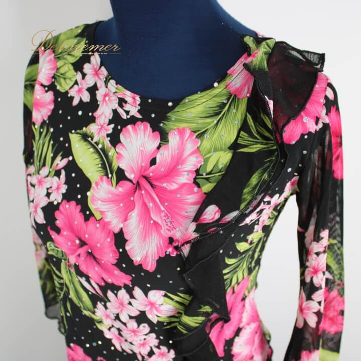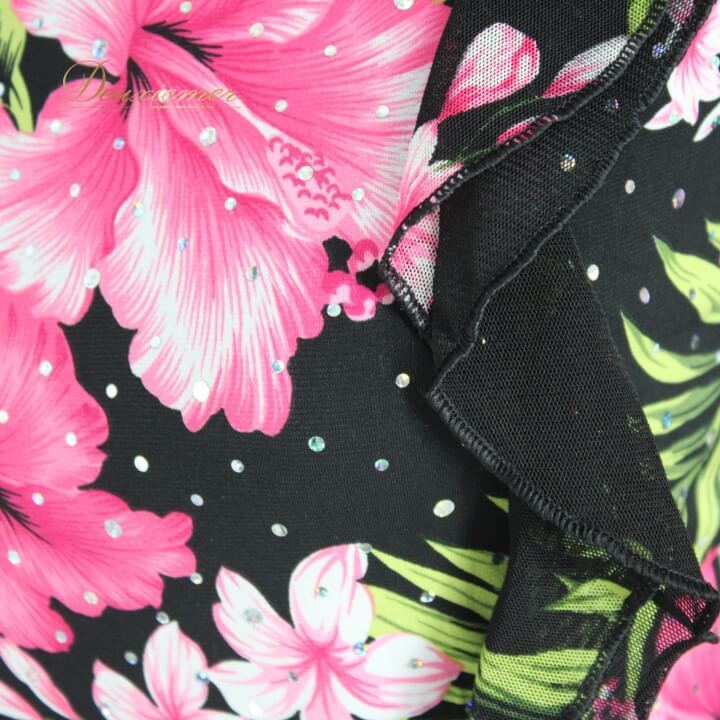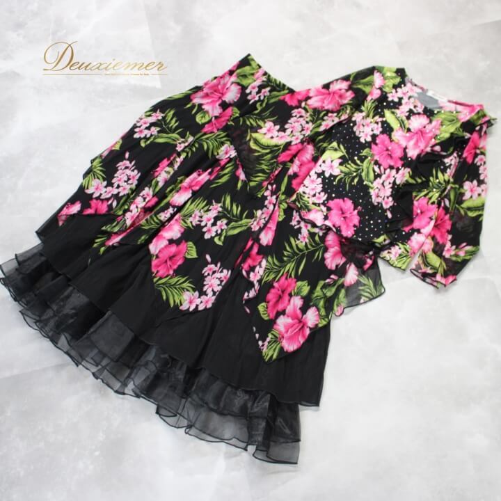 社交ダンス 衣装 スタンダード セットアップ 上下セット レッスンウェア パーティ衣装 女性用 レディース オールシーズン 花柄 ブラック系 SICO-PON ピンク系 社交ダンス衣装 フラワープリント 花模様 フレアスカート シフォン素材 カジュアル