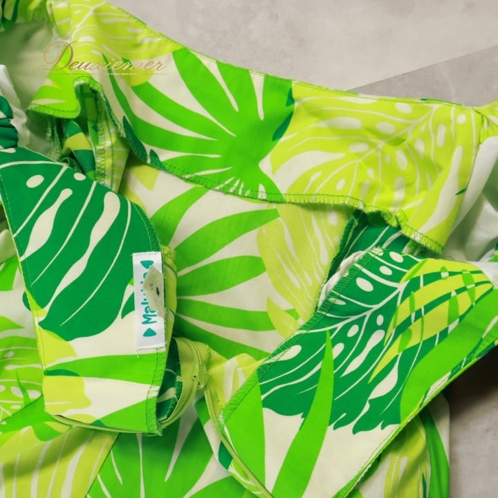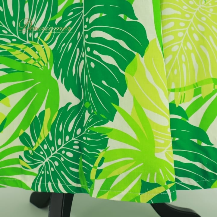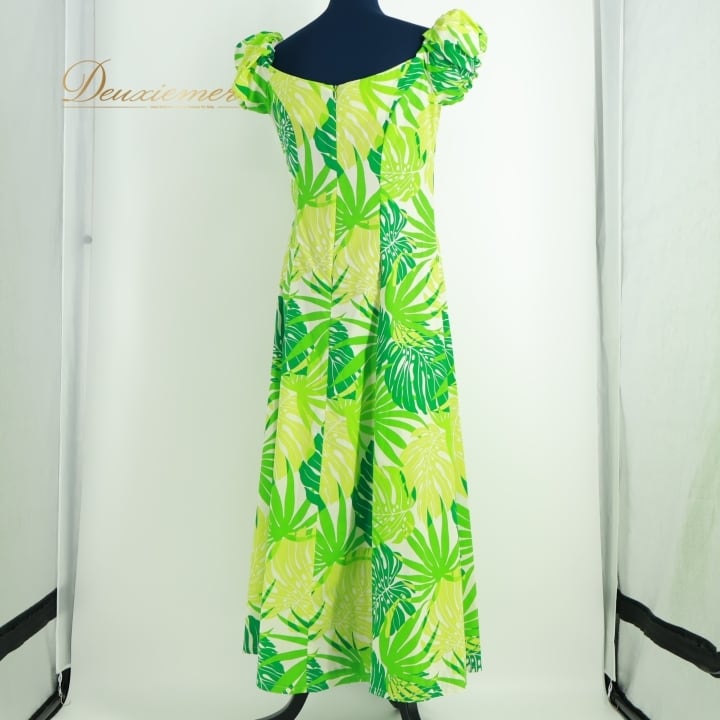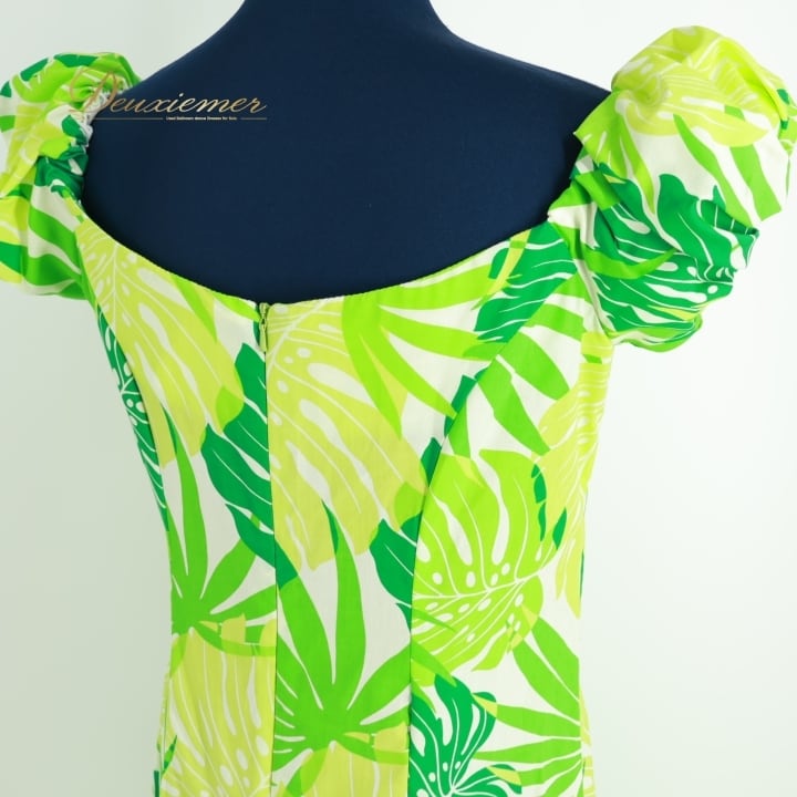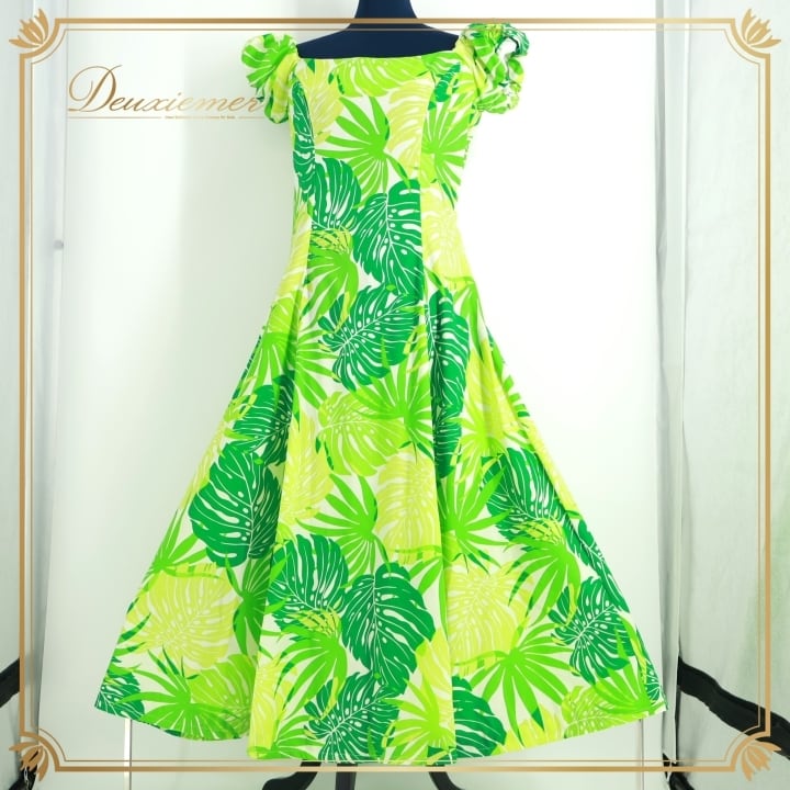 フラダンス 衣装 ワンピース ドレス グリーン系 Maluhia フラ ダンス モンステラ柄 白 緑 黄緑 華やか 明るい ハワイ製 ハワイアン アロハ ハワイアンプリント ホワイト系