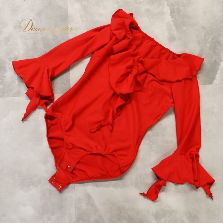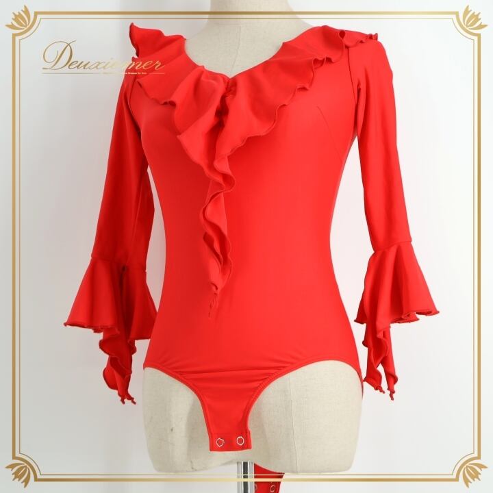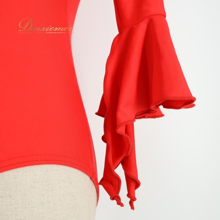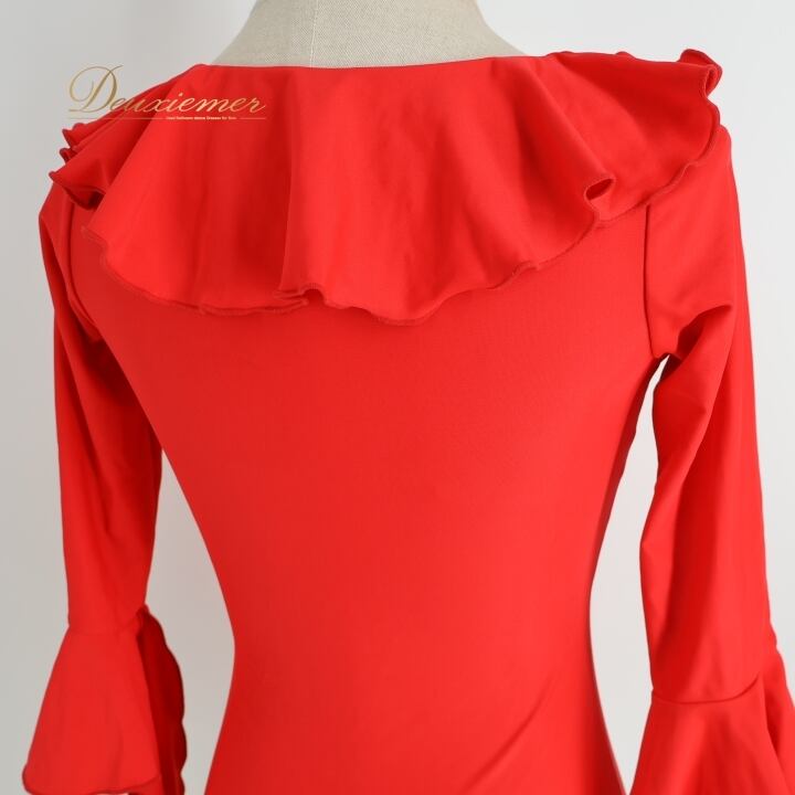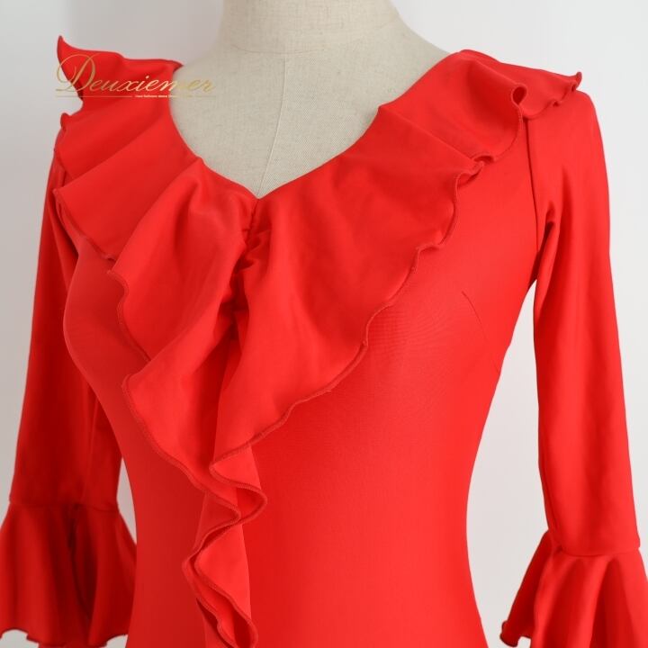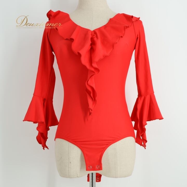 社交ダンス 衣装 レオタード レッド系 タカダンス TAKA DANCE 赤 フリル 華やか 無地 トップス パーティー 上品 レッスン 練習 ストレッチ 伸縮 フラメンコ