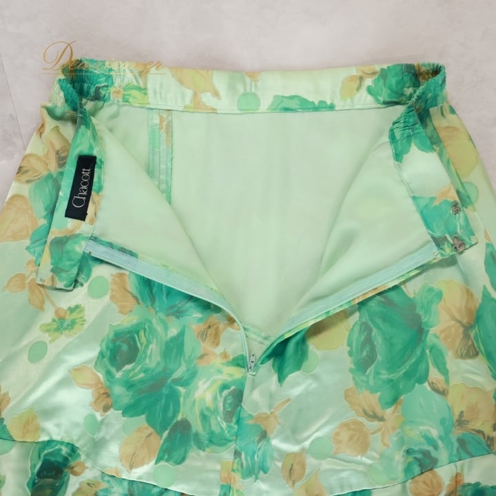 社交ダンス 衣装 スカート Chacott チャコット グリーン系 花柄 緑 茶 フリル ひざ丈 バラ柄 淡い 上品 華やか レッスン 練習 かわいい ブラウン系