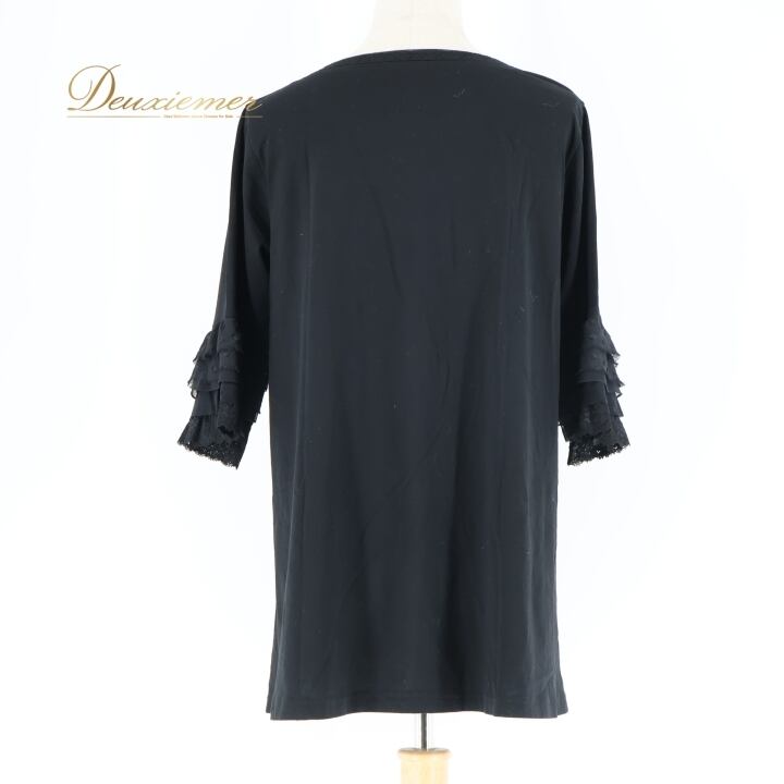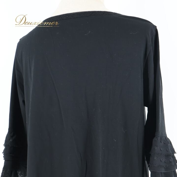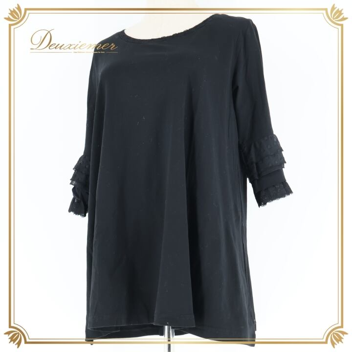 レディース トクコプルミエヴォル TOKUKO 1er VOL トップス 黒 無地 フリル レース チュニック ブラック系 秋 フレア 長袖 シンプル カジュアル おしゃれ 大人 可愛い ストレッチ 秋冬 軽い