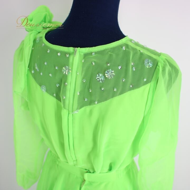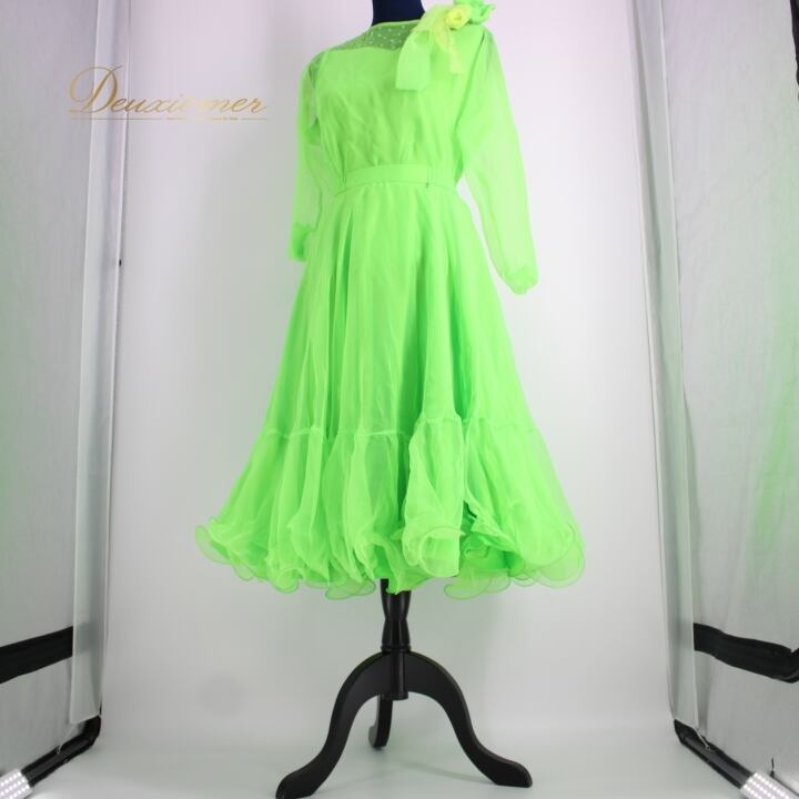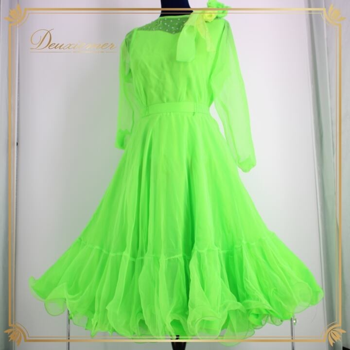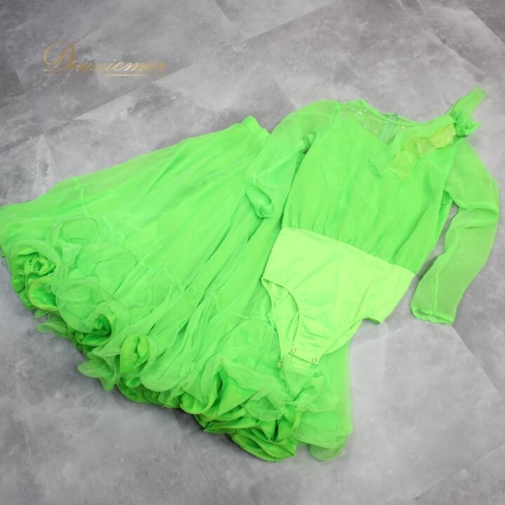 #社交ダンス #ダンス衣装 #ヒロコ #蛍光グリーン #おしゃれ #ダンスウェア #イベント衣装 #パーティー #華やか #スカート #トップス #レオタード #ステージ映え #ファッション #女性用トルソー #安定感 #伸縮性 #ダンスファッション #コスチューム #ENUTSU
