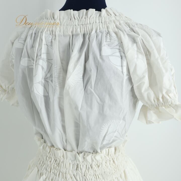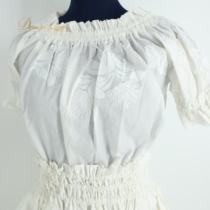 フラダンス 衣装ツーピース セットアップ 上下セット ホワイト系 レフア柄 白 トップス ブラウス パウスカート スカート 爽やか ハワイアン アロハ 華やか ハワイアンプリント