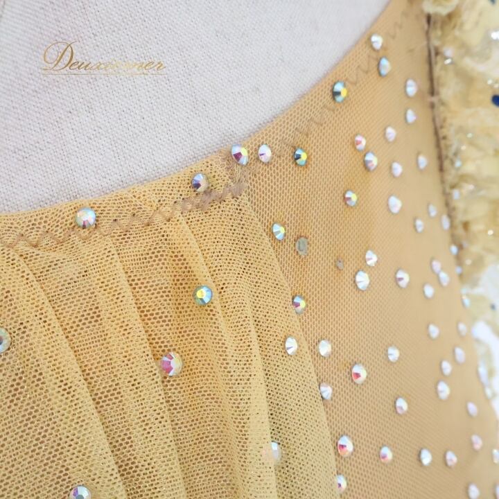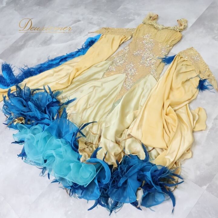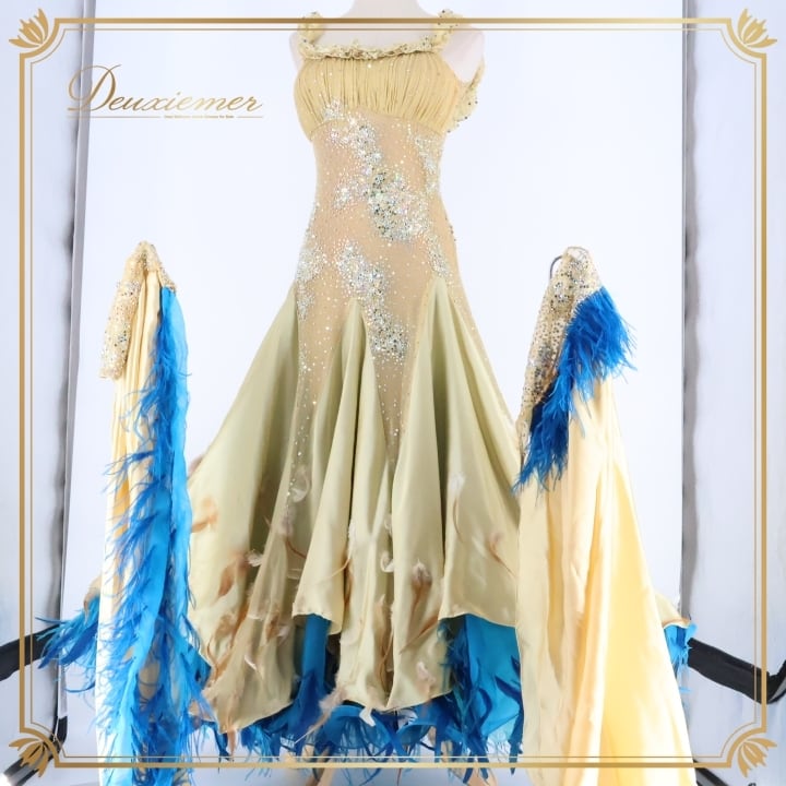 社交ダンス 衣装 タカダンス TAKADANCE スタンダードドレス スタンダード ドレス ワンピース フロート ゴールド系 ベージュ系 フロート 青 羽 金 高級感 豪華 ダンス衣装 競技用ドレス パーティードレス 美しいデザイン 鮮やか 色合い フロート付き ステージ衣装 踊