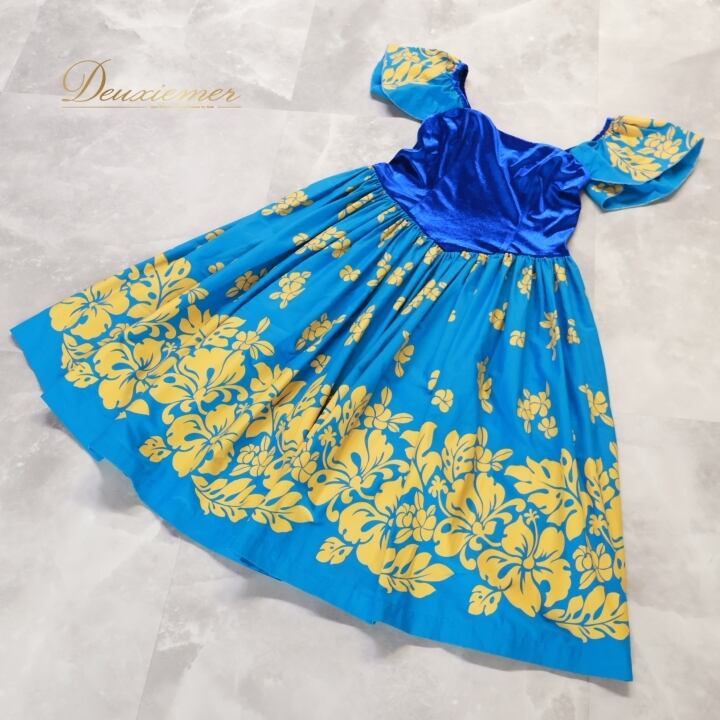 フラダンス 衣装 ワンピース ドレス ブルー系 フラ ダンス 青 黄 ベロア 光沢 プルメリア柄 ハイビスカス柄 モンステラ柄 ハワイアン アロハ 華やか 鮮やか かわいい 花柄 ハワイアンプリント イエロー系
