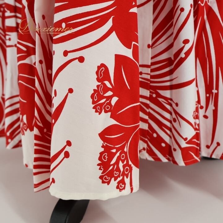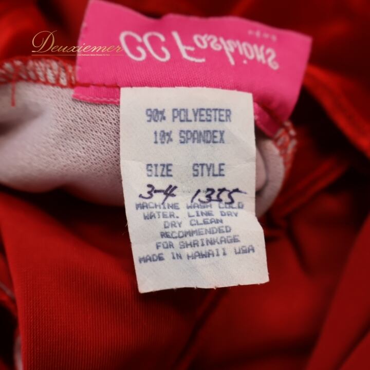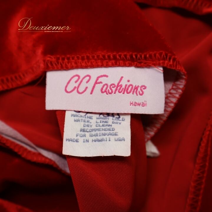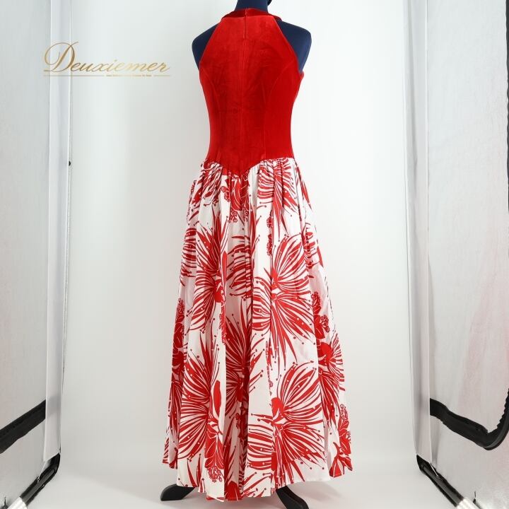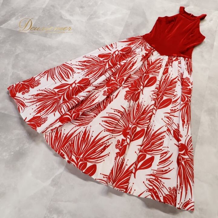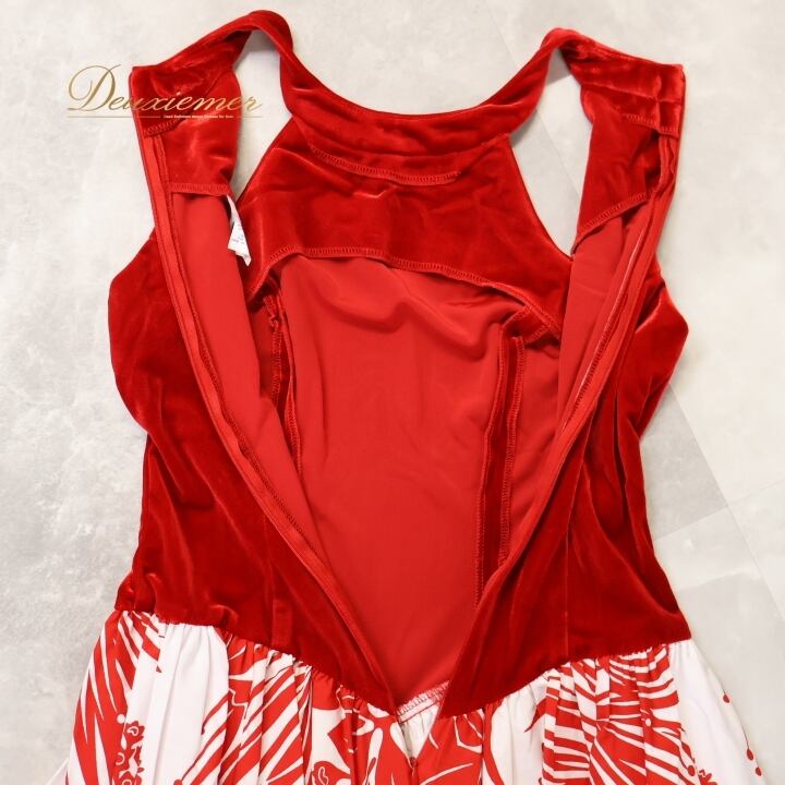 フラダンス 衣装 ワンピース ドレス レッド系 CC Fashions 赤 白 レフア柄 花柄 華やか 鮮やか ハワイ製 ハワイアン アロハ ベロア ノースリーブ ハワイアンプリント ホワイト系