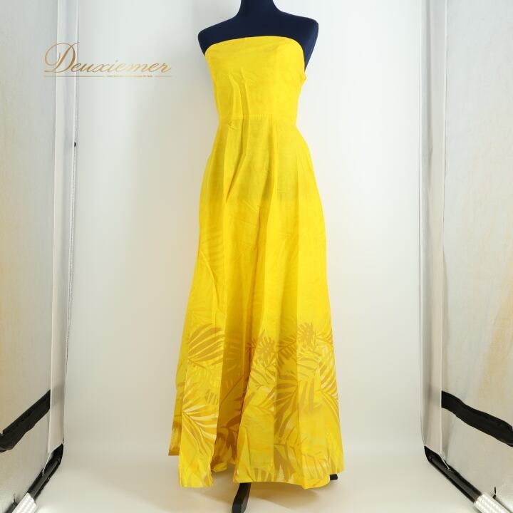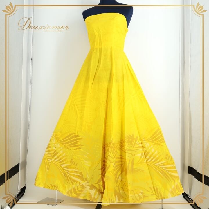 フラダンス 衣装 ワンピース ドレス イエロー系 マーメイドライン ヤシ柄 ラウアエ柄 黄 チューブトップ 鮮やか MermaidLine MMJ エムエムジェイ 華やか 鮮やか ハワイアン アロハ かわいい ハワイアンプリント ブラウン系